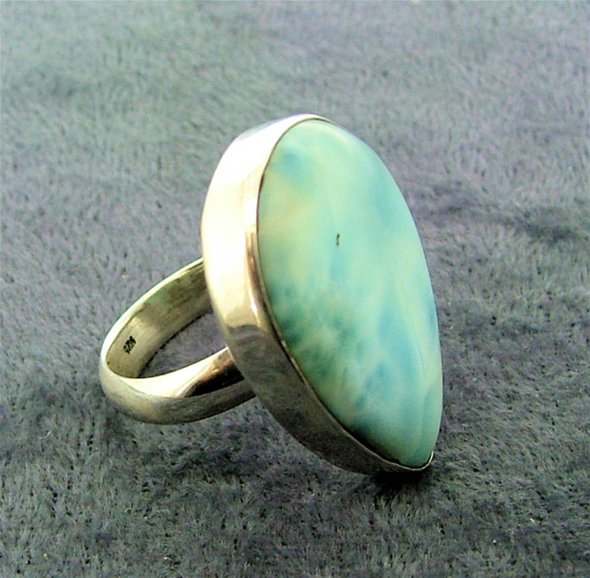 Features a large tear drop shape dome polished cabochon in larimar.ring size = r+weight = 15gsize of cabochon = 29mm x 21mm..