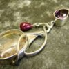 One off 925 silver pendant featuring a large chlorite in quartz cabochon with a smaller faceted amethyst cabochon & a tear drop shape dropper in ruby.pendant size-88mm drop including bail x 26mm wide. 30g.CABOCHON Sizes-chlorite in quartz-27 x 21mm. Amethyst-15 x 10mm. Ruby-10 x 6mm.