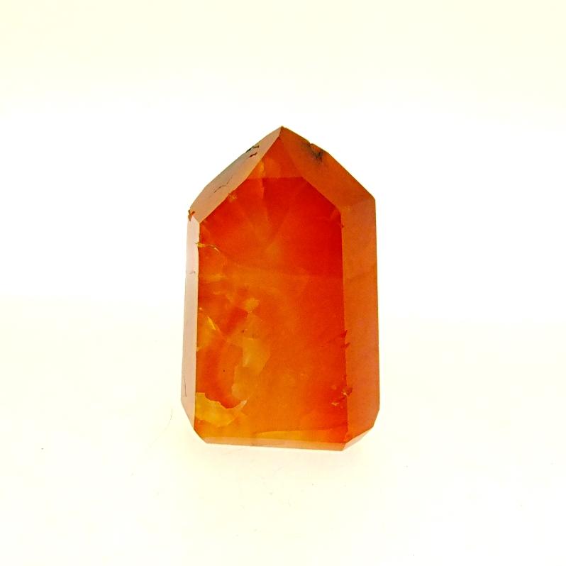 polished carnelian point specimen featuring flat cut base to stand. ,