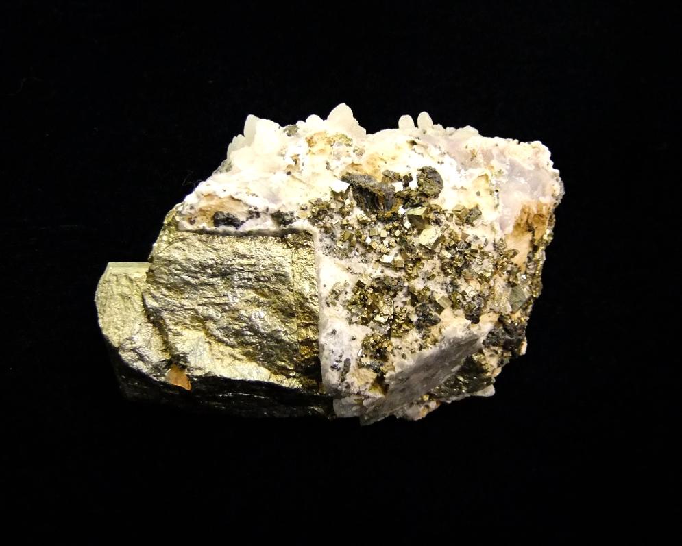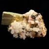 Quartz cluster formations with rhodonite on pyrite crystal specimen. ,  ,