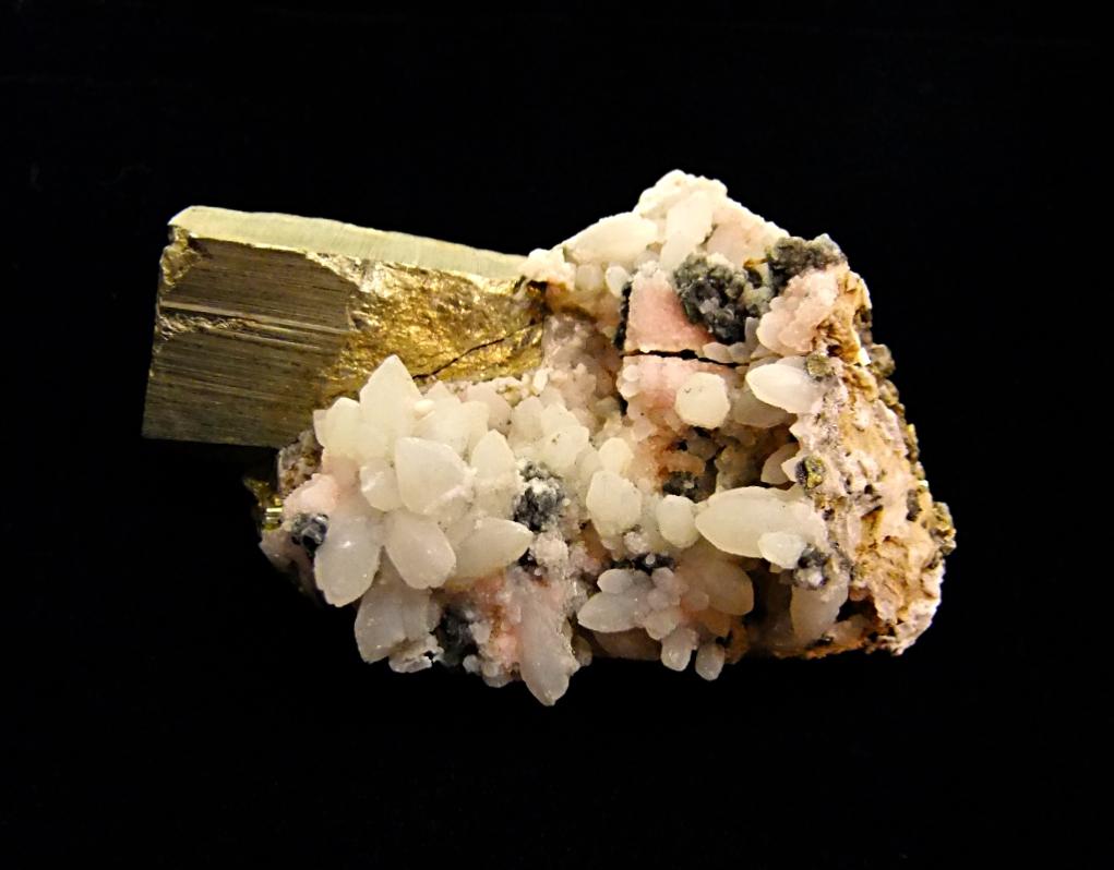 Quartz Cluster Formations with Rhodonite on Pyrite Crystal Specimen