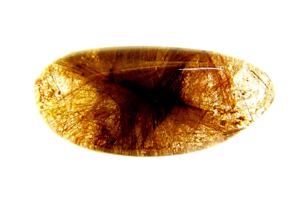 quartz dome polished pebble specimen featuring red &, golden rutile inclusions.