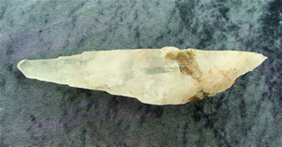 Quartz laser twin point specimen. A wonderful large laser point with small hematite coated bridges-milky/ cloudy, providing a very soft & gentle energy. A very earthy feel to this piece. Very special !.SIZE = 188mm in length x 49mm x 34mm aprox.WEIGHT = 340g.