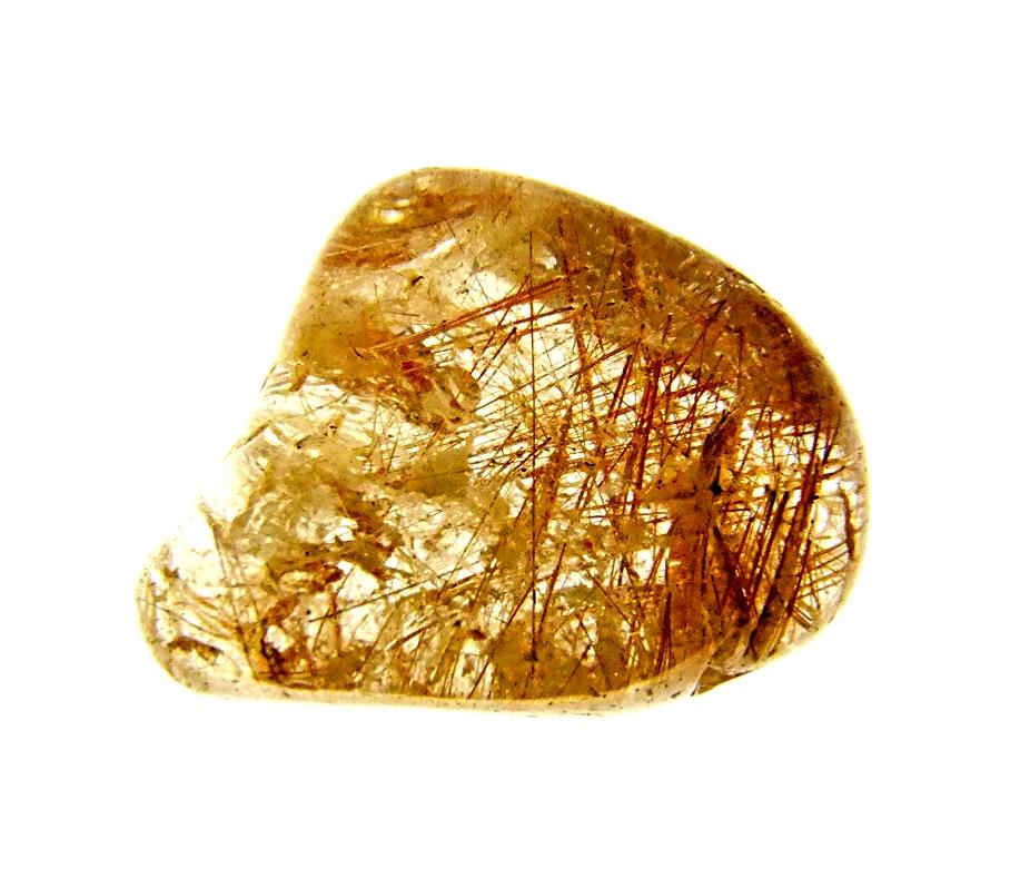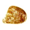 quartz polished pebble specimen featuring red &, golden rutile inclusions.