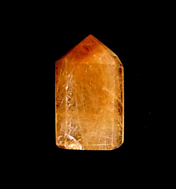 quartz polished point specimen featuring golden rutile inclusions (has slight chip to base).