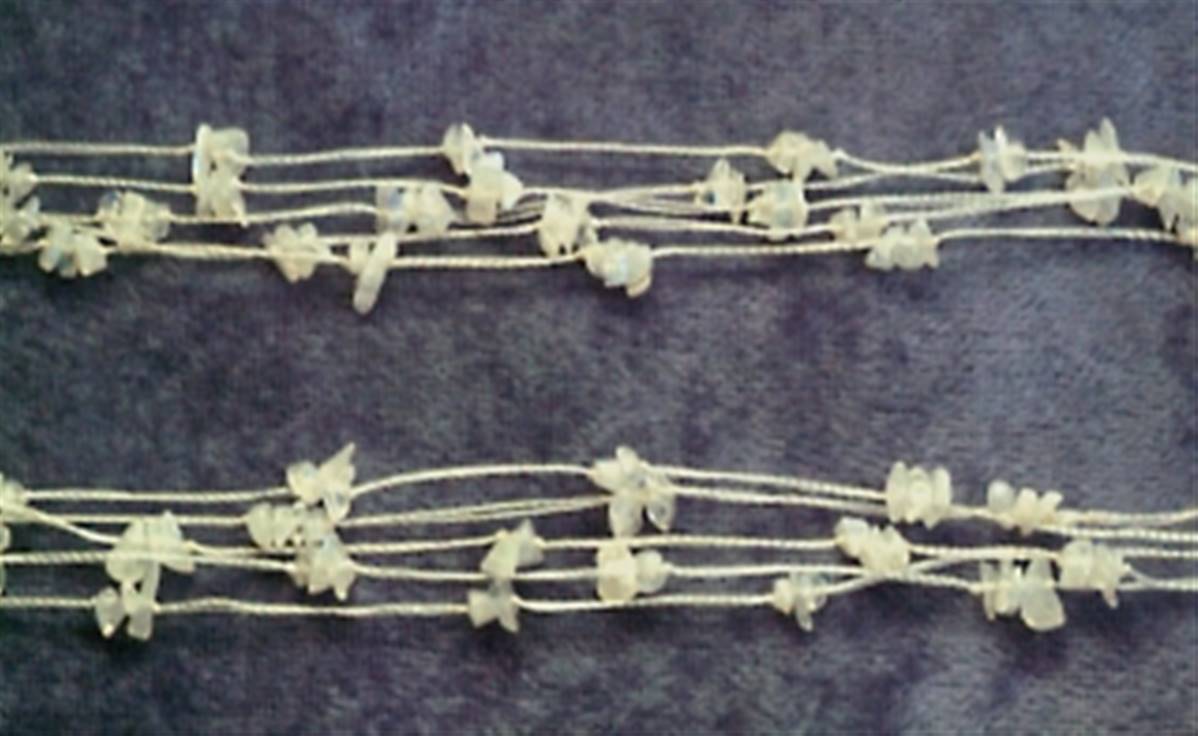 RAINBOW MOONSTONE THREADED GEM CHIP NECKLACE. 18″ LONG. 10g. FEATURING A GOLD PLATED LOBSTER STYLE CLASP.