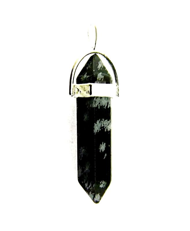 SNOW FLAKE OBSIDIAN DOUBLE TERMINATED HEALING POINT PENDANT FEATURING A SILVER PLATED BAIL.