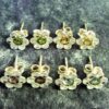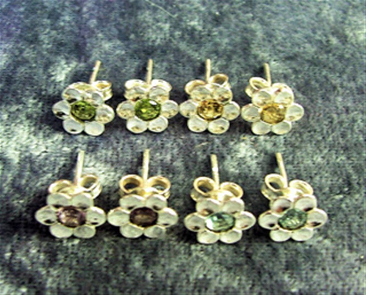 FEATURING FLOWER DESIGN WITH A SINGLE ROUND FACETED CABOCHON IN EITHER-PERIDOT, CITRINE, AMETHYST OR TOPAZ.SIZE = HEAD DIAMETER 9MM.WEIGHT PER PAIR = 4g.SIZE OF CABOCHON = 4MM.