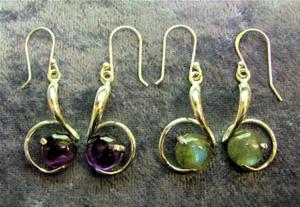 THESE EARRINGS FEATURE ROUND DOME POLISHED CABOCHONS IN AMETHYST OR LABRADORITE.SIZE OF EARRINGS = 45MM IN LENGTH INCLUDING EARWIRE x 15MM WIDE.SIZE OF CABOCHONS = 9MM IN DIAMETER.WEIGHT PER PAIR = 6g.