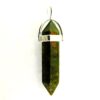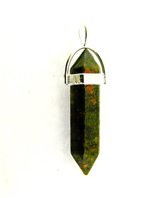 UNAKITE DOUBLE TERMINATED HEALING POINT PENDANT FEATURING A SILVER PLATED BAIL.