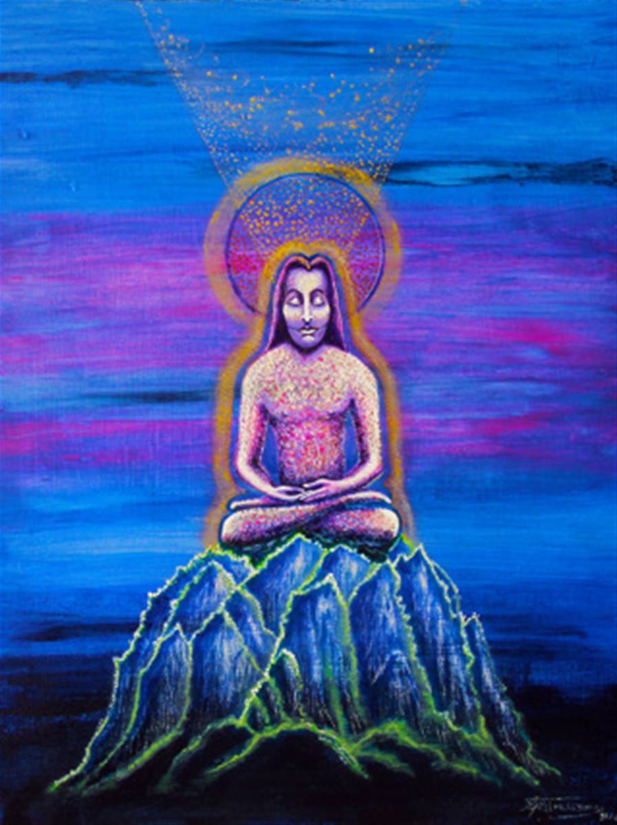 This image came to the artist during morning meditation. This figure depicts the yogic pracititioner undergoing a mystical transformation as he absorbs the inflow of cosmic energy into his being. His aura is transformed as his ego mind dissolves and he experiences bliss and the all encompassing unconditional love that is the essence of the cosmos. It shows how all negative impulses and karma can be transmuted into pure unadulterated energy that is the stuff of the universe. This ultimate compassion is then generated out into the world automatically for the benefit of all sentient beings. People that have seen this painting commented that they found it calmed their minds and triggered a meditative state.A4 size print with bevelled mount.approximate size 40 x 33cm.Each limited edition print of 500 only comes with a numbered certificate signed by the artist.
